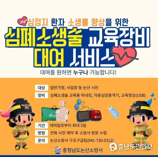 (충남도민일보) 논산소방서는 시간이나 장소에 구애받지 않고 심폐소생술 교육 장비 대여서비스를 연중 운영 중이라고 밝혔다.