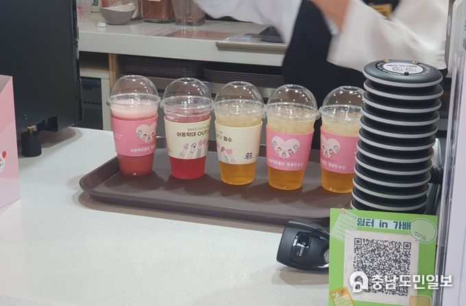 컵 홀더에는 ‘아동학대 없는 행복한 논산’, ‘테이크 Out은 선택, 아동학대 Out은 필수’ 등의 문구가 적혀 있다. 커피를 마시며, 아이들이 행복한 논산을 떠올리자는 취지가 담긴 캠페인이다.