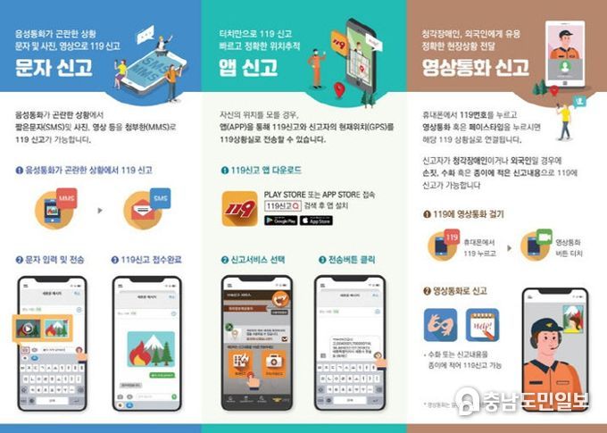 (충남도민일보) 논산소방서는 각종 재난 발생 시 다양한 방법(문자, 앱, 영상통화)으로 신고할 수 있는 '119다매체신고서비스'를 운영하고 있다고 밝혔다.
