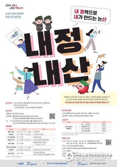 논산시ㆍ논산시청소년행복재단 주최, 제17기 논산시청소년참여위원회 주관으로 열리는 공모전 '내정내산'은 청소년이 스스로 지역사회 내의 문제들을 발견하고 해결에 필요한 정책 아이디어를 발굴해볼 수 있는 사회참여의 장을 펼치고자 마련됐다.