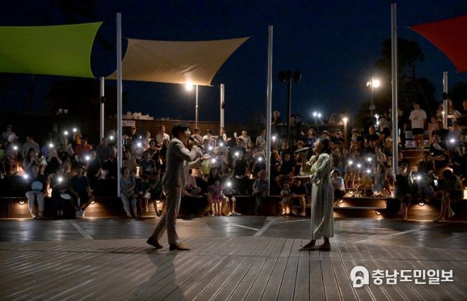 (논산=충남도민일보) 천혜의 자연경관, 전국 최대규모의 출렁다리와 미디어 파사드, 음악분수 등을 통해 많은 사랑을 받고 있는 논산 탑정호에서 열대야를 식히는 음악공연이 펼쳐졌다.