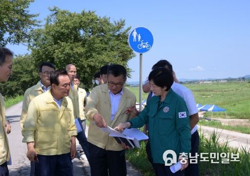 (충남도민일보) 지난 7일 논산시를 찾은 한화진 환경부 장관이 백성현 논산시장과 함께 논산천 논남2제 응급 복구 현장을 시찰하고 있다. 한 장관은 북상 중인 제6호 태풍 ‘카눈’으로 인한 추가 호우 피해에 대비하고자 논산시를 방문해 현장을 두루 살폈다.