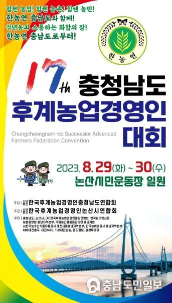 (논산=충남도민일보) 충남 1만2천 후계농업경영인들의 축제인 ‘제17회 충청남도 후계농업경영인대회’가 8월 29일부터 30일까지 2일간 논산시 시민운동장 일원에서 개최된다.