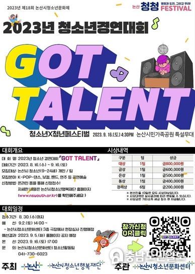 (충남도민일보) 올해로 18회째를 맞는 논산시청소년문화제의 메인 코너라 할 수 있는 ‘Got Talent 경연대회’를 앞두고, 논산시청소년행복재단 청소년문화센터가 참가자를 모집한다.