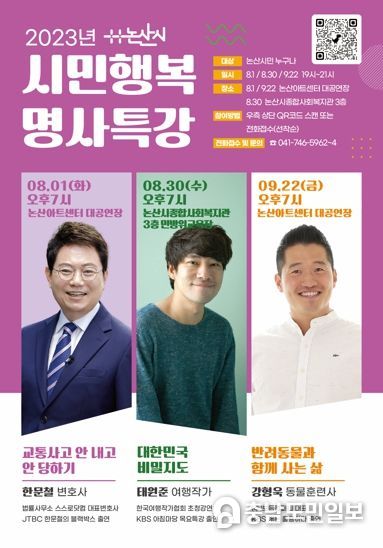 (충남도민일보) 논산시가 오는 30일 논산시 종합사회복지관 3층 민방위 교육장에서 올해 두 번째 시민행복 명사특강을 개최한다.