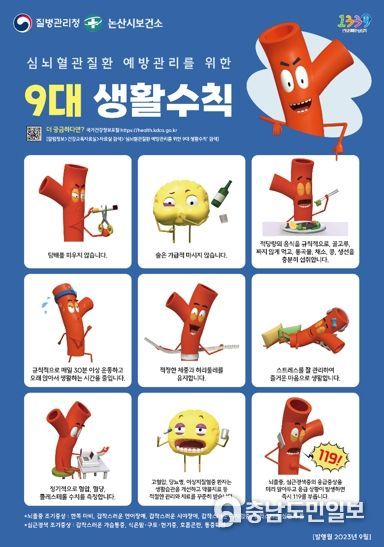 또한 지속적으로 마을을 순회하며 60대 이상 건강취약계층에게 ‘심뇌혈관질환 예방 9대 생활수칙’을 전파할 예정이다. 이 밖에 심뇌혈관질환 예방관리 관심도 제고를 위해 논산시민가족공원, 하나로마트, 화지중앙시장 등에서의 캠페인도 추진한다는 방침이다.