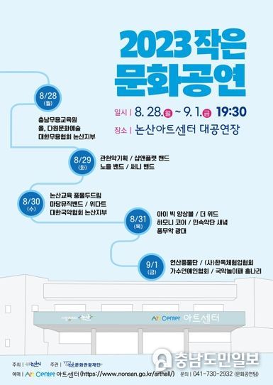 (충남도민일보) 논산문화관광재단이 8월 28일부터 내달 1일까지를 ‘문화가 있는 주간’으로 정하고 ‘작은 문화 공연’을 선보인다고 밝혔다.