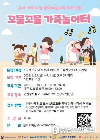 '꼬물꼬물 가족놀이터'는 충남문화관광재단이 주관하는 ‘2023 문화예술교육 현장 역량강화 사업’의 일환으로 기획됐으며, 유아와 보호자가 함께 명화ㆍ명곡을 신체놀이, 합주놀이, 창작놀이 등 다양한 방법으로 표현하고 경험하게 만드는 프로그램이다.