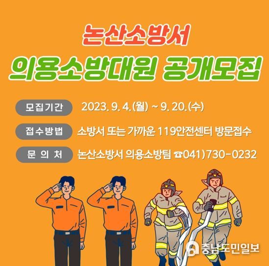 (충남도민일보) 논산소방서는 오는 20일까지 투철한 봉사정신을 바탕으로 각종 소방업무 보조 활동으로 화재예방과 지역안전을 위해 힘쓸 신규 의용소방대원을 공개 모집한다고 밝혔다.