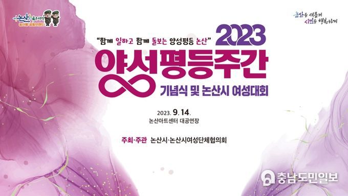 (논산=충남도민일보) 논산시가 주최하고 논산시여성단체협의회가 주관하는 ‘2023년 양성평등주간 기념행사’가 오는 14일 오후 1시 30분부터 논산아트센터 대공연장에서 개최된다.