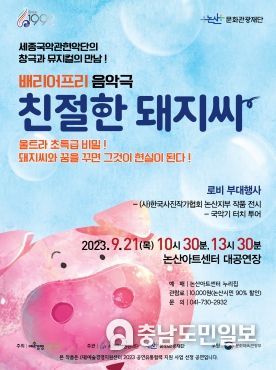 (논산=충남도민일보) 논산문화관광재단이 오는 21일 논산아트센터 대공연장에서 세종국악관현악단과 함께하는 배리어프리 음악극 '친절한 돼지씨' 공연을 2회(오전 10시 30분, 오후 1시 30분)에 걸쳐 진행한다.