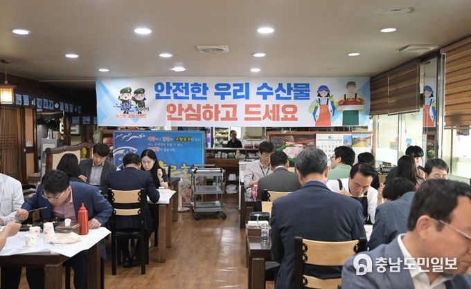(충남도민일보) 백성현 논산시장이 13일 시청 관계자들과 함께 관내 수산물 전문 음식점을 찾아 오찬 시간을 갖고 안전한 우리 수산물 소비 홍보에 힘을 보탰다.