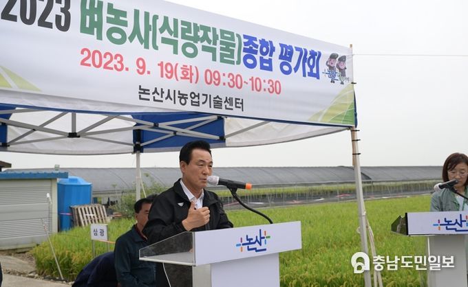 (충남도민일보) 논산시가 지난 19일, 광석면 이사리에 소재한 벼 품종 비교 농지에서 벼전문농업인연구회원, 쌀 전업농가 등 120여 명이 참석한 가운데 ‘2023년 벼농사 종합평가회’를 개최했다.