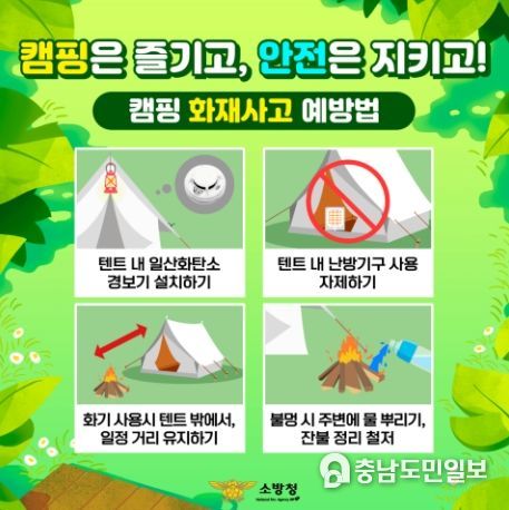 강신옥 예방안전과장은 “캠핑 등 야외 레져 인구가 늘어난 만큼 안전사고 발생 우려 또한 크게 증가했다”며, “화재나 일산화탄소 중독사고를 방지하기 위해 텐트 내에 일산화탄소 경보기를 설치하고 캠핑 안전수칙을 준수하여 즐거운 캠핑을 하기 바란다”고 전했다.