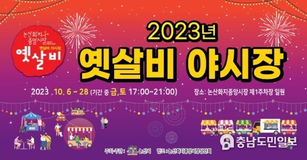 논산시는 6일 오후 5시 화지중앙시장 제1주차장에서 ‘2023 옛살비 야시장’ 개막 행사를 열고, 6일부터 28일까지 매주 금ㆍ토요일 저녁(17시~21시)에 야시장을 운영한다고 밝혔다.