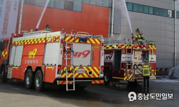 훈련은 한미식품 논산공장에서 전기차 충전 중 발생한 화재가 공장동으로 확산, 건물 일부가 붕괴되고 다수의 사상자가 발생한 상황을 가정해 ▲재난 발생에 따른 상황전파·신고 ▲자위소방대 초기 대응활동 ▲건물 붕괴 및 화재발생에 따른 인명구조와 화재진압 ▲긴급구조통제단 가동 및 유관기관 현장활동 ▲상황조치 보고 및 훈련 강평 순으로 진행됐다.