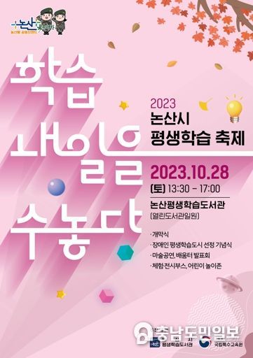 시는 오는 28일 10시에 논산열린도서관(관촉로 113-23) 일원에서 『2023 논산시 평생학습축제』의 막을 연다고 밝혔다. 아울러 올해 축제는 논산시가 지난 3월 교육부(국립특수교육원)로부터 ‘장애인 평생학습도시’로 지정됨에 따라 장애인 평생학습 축제 성격도 함께 띠게 되어 의미가 깊다고 전했다.