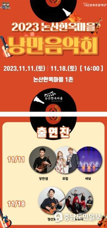 (충남도민일보) 논산문화관광재단이 논산한옥마을(충남 논산시 연산면 임3길 2) 1촌 대청마루에서 제2회 ‘낭만음악회’를 개최한다.