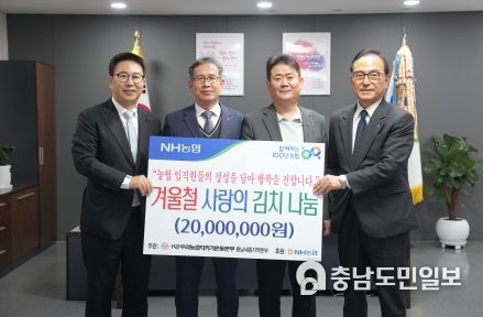 (충남도민일보) 우리농업지키기운동본부 충남지역본부와 NH농협은행 천안시지부가 16일 사랑의 김장김치 400박스(2,000만 원 상당)를 천안시복지재단에 전달했다.