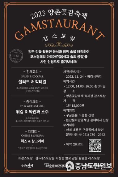(충남도민일보) 개막을 약 2주 앞둔 ‘2023 양촌곶감축제’가 다채로운 프로그램으로 전국 관광객을 맞이하고자 준비 중인 가운데, 신규 콘텐츠인 '감스토랑'의 사전 예약을 접수한다.
