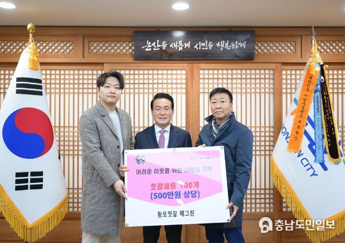 엄건식 황토젓갈 대표는 “얼마 전 열린 아시아한상대회 등의 계기로 강경젓갈이 해외시장으로 진출하는 등 올 한해 기분 좋은 소식들이 많았다”며 “논산시의 진취적 움직임 덕에 얻은 결실을 지역사회에 다시금 돌려드리고 싶다”며 기부 취지를 밝혔다.