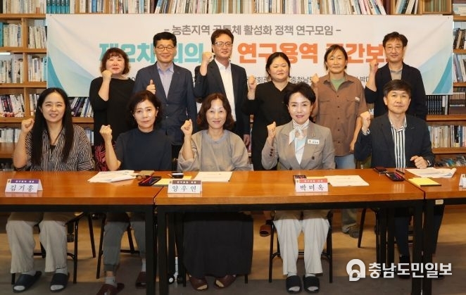 (충남도민일보 =충남) 정연호기자/ 충남도의회 ‘농촌지역 공동체 활성화 정책 연구모임’(대표 박미옥)은 지난 13일 홍성군 장곡 오누이다목적회관에서 제2차 회의 및 연구용역 중간보고회를 열고, ‘충청남도 농촌 경제・사회서비스 공동체 지원센터’ 설치를 골자로 한 정책 추진 방향을 논의했다.