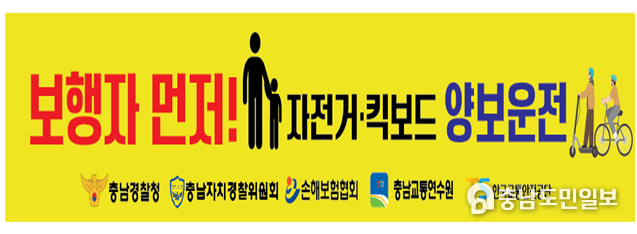 (충남도민일보(도민방송) =충남) 최정환기자/ 충남경찰청(청장 임정주)과 충남자치경찰위원회(위원장 이종원)는 교통사고로부터 소중한 생명을 지키고 차보다 사람이 먼저인 교통문화 확산을 위해 ‘보행자 먼저! 자전거·킥보드 양보운전’ 바닥 스티커 465매를 보행자사고 위험구역에 집중 부착할 계획이라고 밝혔다.