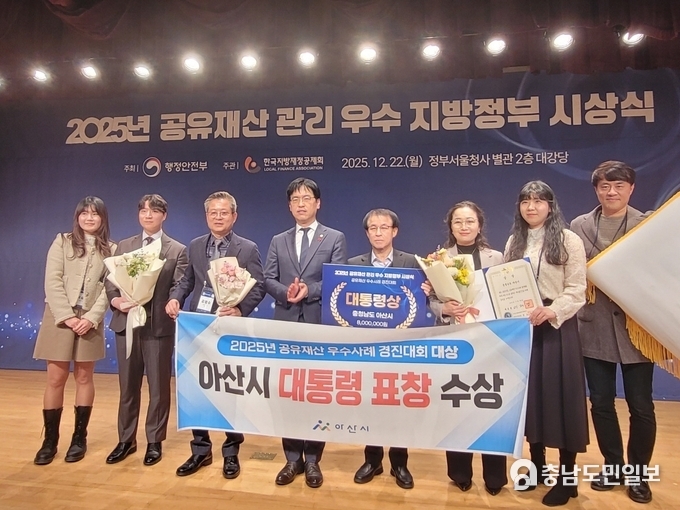 (충남도민일보=아산) 정연호기자/ 아산시(시장 오세현)는 행정안전부가 주관한 ‘2025년 공유재산 우수 지방자치단체 시상식’에서 우수사례 경진대회 부문 전국 1위에 해당하는 대통령상을 수상했다고 22일 밝혔다.