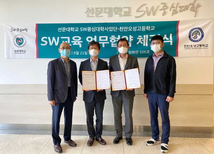 [아산=충남도민일보]정연호기자/ 선문대학교(총장 황선조)가 천안오성고등학교(교장 조영종)와 21일 4차 산업산업혁명 시대의 핵심 요소인 인공지능과 소프트웨어에 교육을 강화하기 위한 협약을 체결했다.