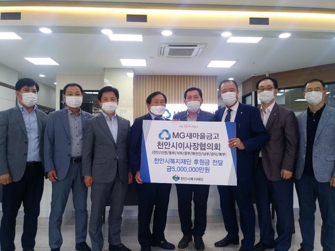 [천안=충남도민일보]인숙진기자/ 새마을금고 천안시이사장협의회(협의회장 현광채)가 26일 지역 복지가 향상될 수 있도록 천안시복지재단에 500만원의 후원금을 전달했다.