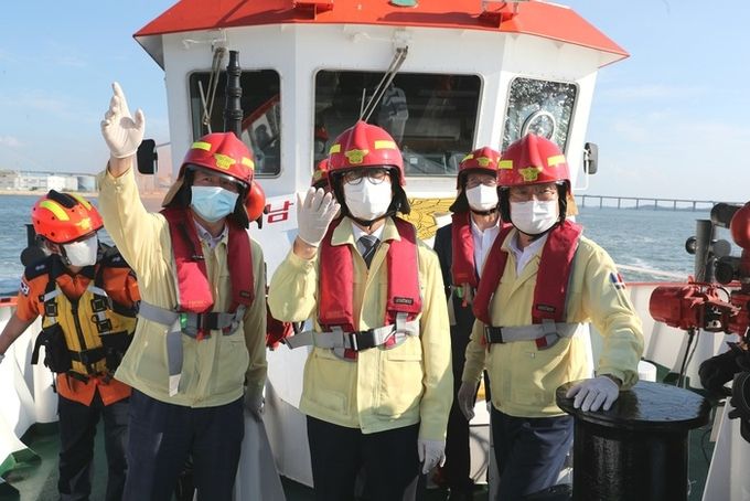 양 지사는 지난 2015년 취항한 소방정에 탑승, 해상조난 신호용 홍염 발사와 소방정 방수포 발사 등을 직접 실시했다.
