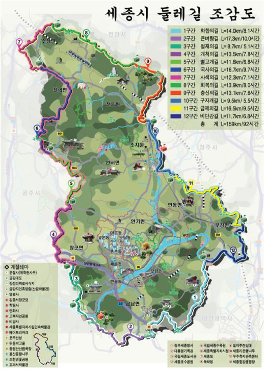 이외에도 시는 내년까지 관내 12개 구간 159㎞에 이르는 세종시계 둘레길을 조성 중으로, 기대하고 있다.