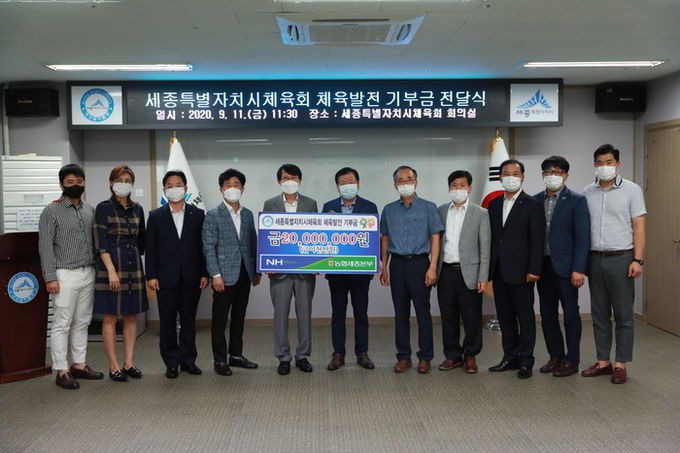 세종특별자치시체육회(회장 정태봉)는 11일 세종시체육회관에서 NH농협은행 세종영업본부의 체육발전 기부금 전달식을 열고, 지역 체육발전을 위해 상생 협력해 나가기로 뜻을 모았다고 밝혔다.