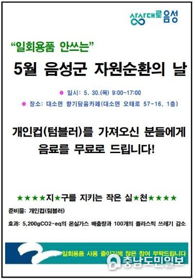 5월 자원순환의 날은 이달 30일 목요일 9:00~17:00까지 대소면 향기담음카페(대소면 오태로 57-16)에서 진행될 예정이며, 카페에 개인 컵을 지참하고 가면 무료 음료를 받을 수 있다.