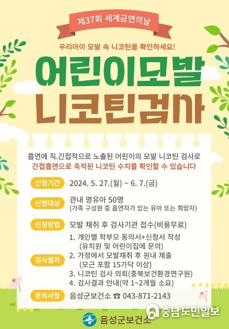 (충남도민일보 / TV / 정호영기자) 음성군 보건소는 5월 31일 세계 금연의 날을 기념해 관내 영유아를 대상으로 간접흡연과 3차 흡연의 피해를 측정하기 위해 ‘모발 니코틴 검사’를 실시한다고 27일 밝혔다.