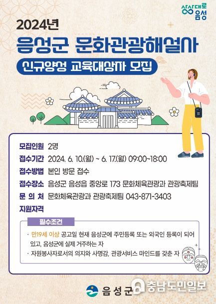 (충남도민일보 / TV / 정호영기자) 음성군은 음성군을 찾는 국내·외 관광객들에게 양질의 해설 서비스를 제공하기 위해 ‘2024년 문화관광해설사 신규양성 교육’ 대상자 2명을 모집한다고 3일 밝혔다.