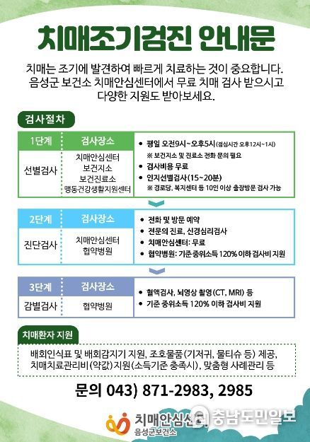 (충남도민일보 / TV / 정호영기자) 음성군 보건소 치매안심센터에서는 매월 ‘지역별 찾아가는 치매선별검사’를 시행한다.