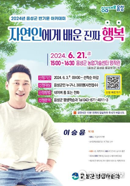 (충남도민일보 / TV / 정호영기자) 음성군은 21일 농업기술센터 명작관에서 방송인 이승윤을 초청해 ‘자연인에게 배운 진짜 행복’이라는 주제로 초청 강연을 개최했다고 밝혔다.