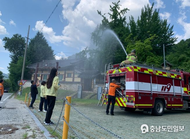 훈련은 목조문화유산 주변 화재 발생 상황을 가상해 화재 전파를 시작으로 화재진압훈련 등 재난에 대비한 소방 훈련을 실전과 같이 펼쳤다.
