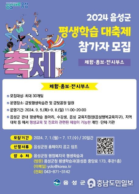 (충남도민일보 / TV / 정호영기자) 음성군은 오는 9월 5일부터 8일까지 열리는 ‘2024년 음성군 평생학습 대축제’에 참여할 참가자를 모집한다고 5일 밝혔다.
