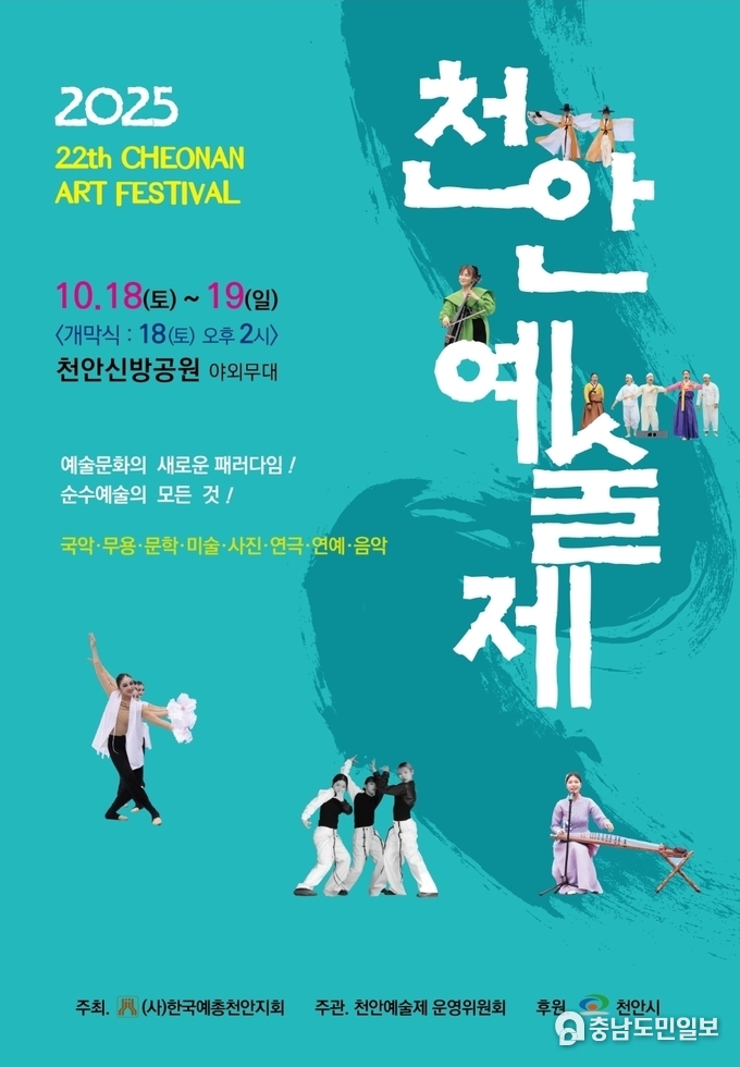 올해로 22회를 맞은 천안예술제는 18일 오후 2시 개막식을 시작으로 다양한 프로그램이 진행된다. ‘예술문화의 새로운 패러다임, 순수예술의 모든것’을 주제로 한 천안예술제의 주요 프로그램은 18일 △무용협회 ‘2025 청소년 댄스경연대회’ △연극협회 ‘마당극 뮤지컬 사랑뎐’ △예술동호인단체 ‘천차만별 콘서트’ △기획프로그램 ‘퍼포밍아트 페스타’ 를 진행한다.