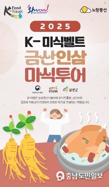 (충남도민일보(도민방송)=금산) 정연호기자/ 금산군은 충남문화관광재단, 농림축산식품부, 한식진흥원과 함께 금산인삼의 매력을 여행으로 즐길 수 있는 케이(K)-미식벨트 금산인삼 미식투어 상품을 출시했다.