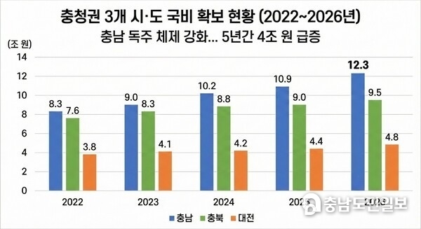 (충남도민일보 =충남) 정연호기자/  충청권 국비 확보 전쟁에서 충청남도가 압도적인 우위를 점하며 '충청 맏형'로서의 입지를 확실히 굳혔다. 이에 충남언론협회는 최근 5년(2022~2026년)간 국비 확보 추이를 분석한 결과, 충남은 매년 조 단위의 기록을 경신하며 타 시·도와의 격차를 벌리고 있는 것으로 나타났다.