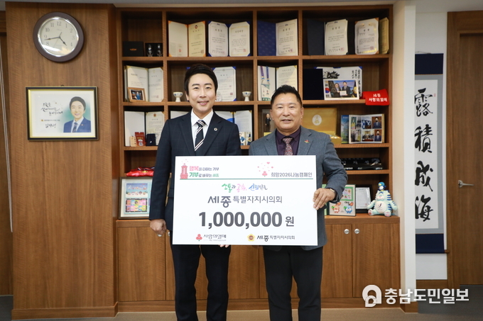 (충남도민일보=세종) 정연호기자/ 세종특별자치시의회(의장 임채성)는 19일 의장 집무실에서 세종사회복지공동모금회에 성금을 기탁하는 ‘희망 2026 나눔 캠페인’ 성금 전달 행사를 진행했다.