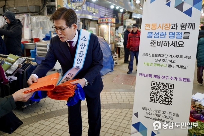 (충남도민일보 =세종) 정연호기자/ 세종신용보증재단(이사장 김효명)은 9일, 설 명절을 앞두고 세종전통시장과 노인복지주택인 밀마루복지마을을 방문해 ‘전통시장 이용 활성화 캠페인’과 ‘행복 나눔 기부’ 활동을 했다.