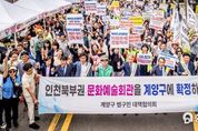 (충남도민일보 / TV / 정호영기자) ‘인천 북부권 문화예술회관 계양구 유치를 위한 범구민 대책협의회’는 계양구 주민 1,000여 명이 참여한 가운데 25일 계양산 주부토로 일원에서 북부권 문화예술회관 계양구 유치를 위한 결의대회를 추진했다고 밝혔다. 이번 결의대회는 현재 인천시가 광역 문화시설이 없는 북부 권역에 1천석 이상 규모의 문화예술회관을 건립하고자 사업 타당성 용역을 진행하고 있는 가운데, 북부권 문화예술회관이 반드시 계양구에 유치되어야 한다는 계양구민의 염원을 인천시에 강력히 호소하고자 마련됐다. 주민들은 문화예술회관 계양구 유치를 염원하며 범구민 대책협의회의 주도하에 ‘인천시는 북부권 문화예술회관 계양구에 건립하라’라는 구호를 외치고, 현수막과 피켓을 들고 거리행진을 실시하며 결의를 다졌다. 행진에 참여한 계양구 예술인연합회 최복수 회장은 “계양구는 인구 10만 명당 등록 공연장 수가 인천에서 최하위 수준으로, 그동안 문화예술의 소외지역으로 지내왔다.”라며 “인천 균형발전 차원에서 북부권 문화예술회관을 반드시 계양구에 건립하여 주기를 간절히 바란다.”라고 말했다. 한편, 범구민 대책