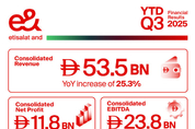 2025년 1~9월 연결 매출 535억 디르함으로 전년 동기 대비 25.3% 증가 2025년 1~9월 연결 순이익 118억 디르함으로 전년 대비 39.7% 증가 그룹 전체 가입자 수2억 220만 명 돌파 아부다비, 아랍에미리트, 2025년 10월 30일 /PRNewswire/ -- e&가 2025년 3분기 연결 기준 매출이 전년 동기 대비 29.2% 증가한 186억 디르함(AED)을 기록했다고 발표했다. 2025년 1~9월 누적 연결 매출은 535억 디르함으로, 전년 동기 대비 25.3% 증가했다. 이는 그룹의 탄력적인 비즈니스 모델과 상반기 역대 최고 실적을 바탕으로 성장을 지속할 수 있는 역량을 반영한다. e& continues strong growth in Q3 2025 with consolidated revenues up 29.2% to AED 18.6 billion 그룹은 전 사업 부문에서 강력한 성장세를 유지했다. 3분기 연결 순이익은 30억 디르함을 기록했으며, 1~9월 누적 연결 순이익은 118억 디르함으로 전년 대비 39.7% 증가했다. 3분기 EBITDA(감가상각 전 영업이익)는