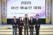 (충남도민일보=아산) 정연호기자/ 아산시의회 문화복지환경위원회는 지난 12월 20일 열린 ‘2025년 아산 예술인 대회’에서 지역 문화예술 발전에 기여한 공로를 인정받 아 감사패를 수상했다. 이번 행사는 (사)한국예술문화단체총연합회 아산지회 주관으로 개최됐으며, 한 해 동안 아산시 문화예술 발전을 위해 헌신해 온 예술인과 유관 단체 관계자들이 한자리에 모여 그 노고를 격려하고 화합을 다지는 뜻깊은 자리로 마련됐다. 이날 감사패는 이춘호 위원장을 비롯해 김은아 부위원장, 맹의석 의원, 천철호 의원, 김미성 의원에게 수여됐다. 문화복지환경위원회는 그동안 문화예술 분야 정책과 예산 심사 등을 통해 지역 예술인의 창작 환경 개선과 문화예술 기반 확충을 위해 지속적으로 노력해 왔으며, 이러한 의정활동 성과가 지역 문화예술계로부터 높이 평가받아 이번 수상으로 이어졌다. 문화복지환경위원회 위원들은 “아산 문화예술 발전을 위해 현장에서 묵묵히 헌신해 온 예술인 여러분께 깊은 감사의 말씀을 드린다”며 “앞으로도 예술인들의 창작 환경 개선을 위해 지속적으로 노력하겠다”고 밝혔다. 아산시의회 문화복지환경위원회는 앞으로도 시민의 삶의 질 향상을 목표로 문화예술 정책을 비롯해 복지