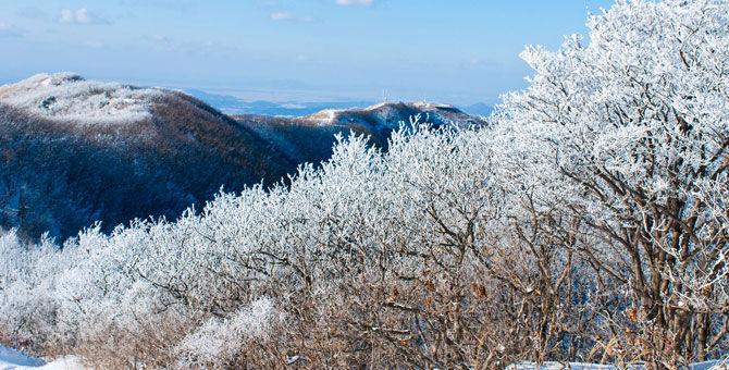 산 정상에서 눈꽃이 맺힌 나무들을 내려다보면 야트막한 나무들의 가지마다 맺혀있는 고운 눈꽃이 전체가 벚꽃으로 가득한 산을 보는 것만큼 아름다운 자태를 볼 수 있다.