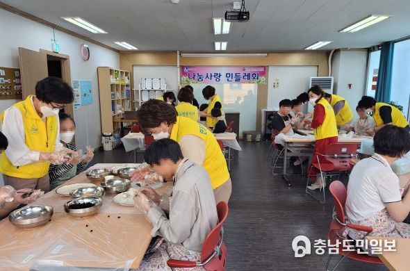 (충남도민일보) 수원시 나눔사랑민들레봉사단이 22일 추석 명절을 앞두고 에이블 장애인직장 적응 훈련센터에서 추석 명절 나눔행사를 진행했다.
